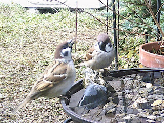 スズメ君、2羽で水盤にやって来ました。少し様子を見たあと、1羽がおもむろに水浴びを始めました。もう1羽はすぐ脇で静観しているようですね。