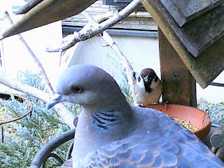 07:39 さいきん、キジバト君はスズメ君たちに出遅れています。今日もエサにありつけずに帰っていきました