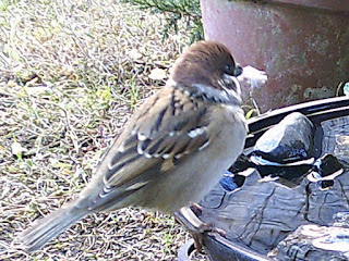 08:00 羽根をくわえたスズメ君がいます。